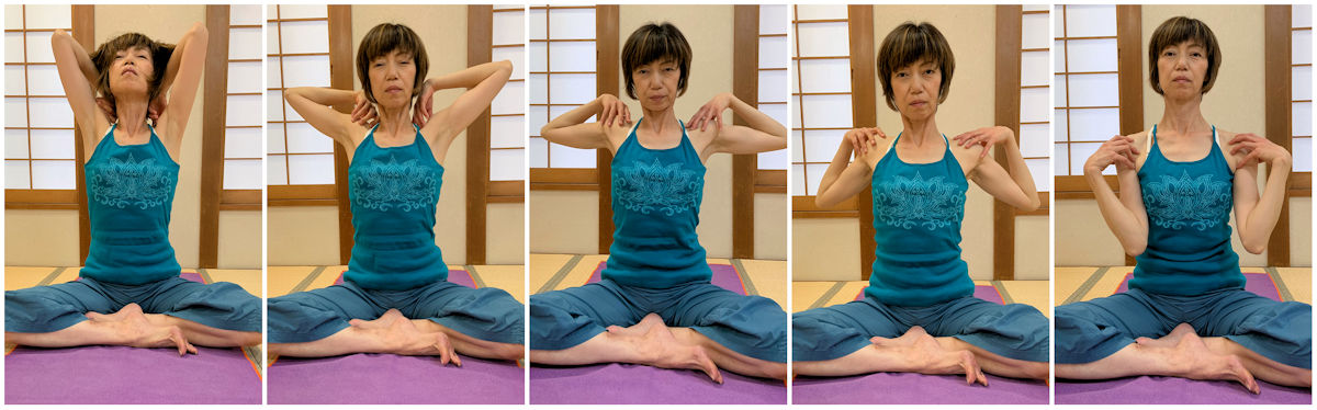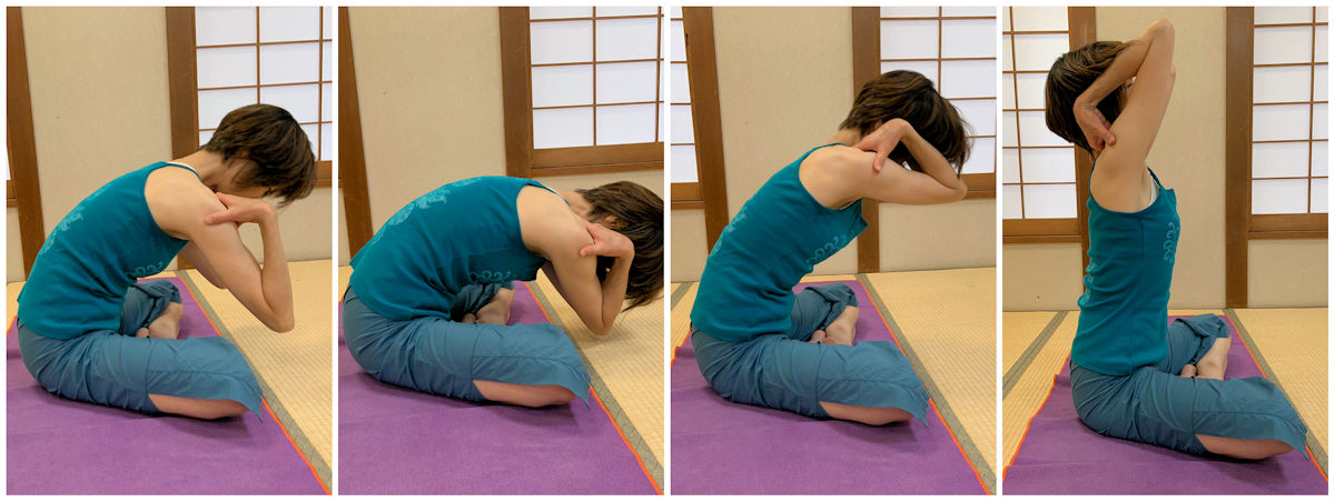 そして肘を回しながら、背骨をゆっくりと起こすように、最後に顔も上げて、肘を上から後ろへと回していきます。