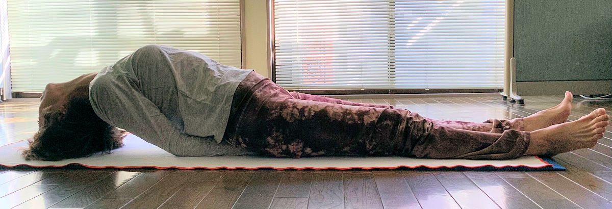 クールダウン〜リラックスの前に魚のポーズで首の前面から胸を伸ばしました。