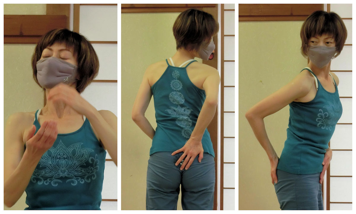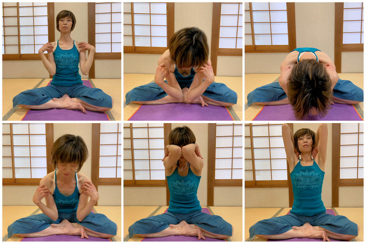 呼吸はまず息を吐いて、吸いながら前から上に、吐きながら後ろへと回していきます。