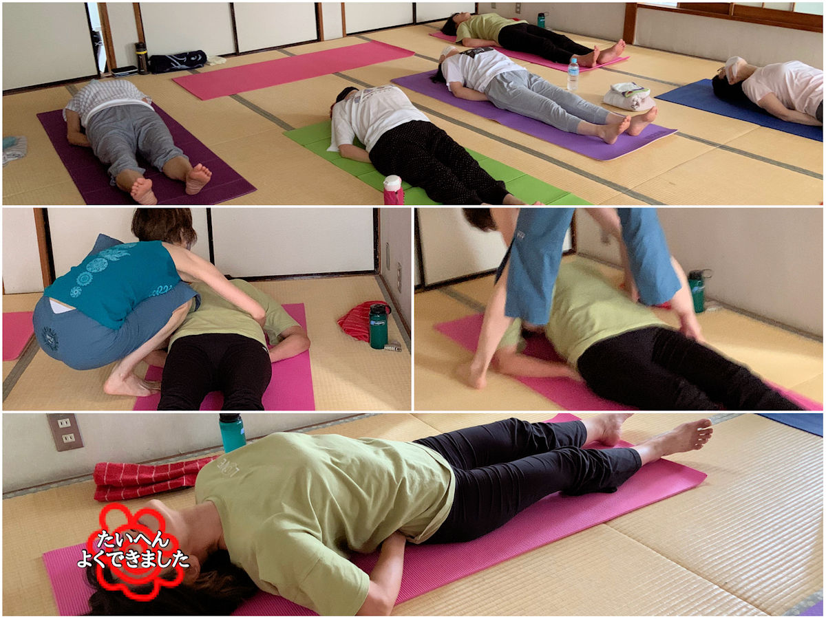 今回は先月と同じ「橋のポーズ」がフィニッシュポーズですが、参加者も異なり、また「ヨガの基本の一つ」とお伝えした「丹田」をさらに意識。